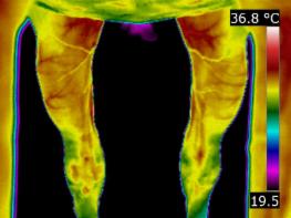 Thermography also can predict and monitor joint inflammation. Normally cool joints might change their thermal pattern before the onset of lameness. The damaged joint can be detected due to the thermal pattern. The practitioner can then use thermography to monitor the effect of treatments. |